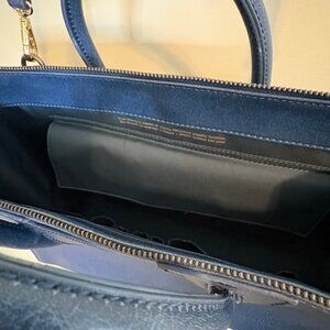 Messenger bag with briefcase functionality. This bag has a 10” ipad compartment, a zipper pocket, two phone pockets and three pen ones. Sleek and minimal looking with a fixed length removable strap to wear as shoulder, cross body, or handbag/briefcase. Vegan leather with a lining made from recycled plastic bottles.