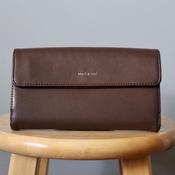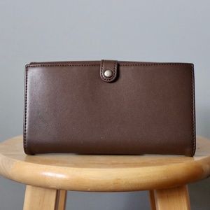 Brown vegan leather wallet with removable card portion. Zippered portion for coins on the inside. Large, button shut area on the front. This wallet is like-new, but does have a disguised mark on the back. Original retail price was $80CAD.