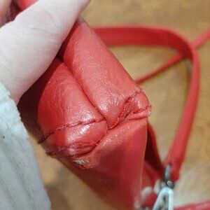 Beautiful red bag by Matt and Natt which is a vegan leather polyvinyl material and has a mixture of smooth and pebbled texture to it. Detachable straps one is a wider shorter strap for a satchel bag look, the other is longer and thinner to be worn as a cross body bag. Inside is super clean with a zippered pocket and smaller pocket for phone. Underneath the flap there is also a snap closure pouch. There is some wear on the very bottom corners (see photos) but otherwise the bag is in excellent shape.