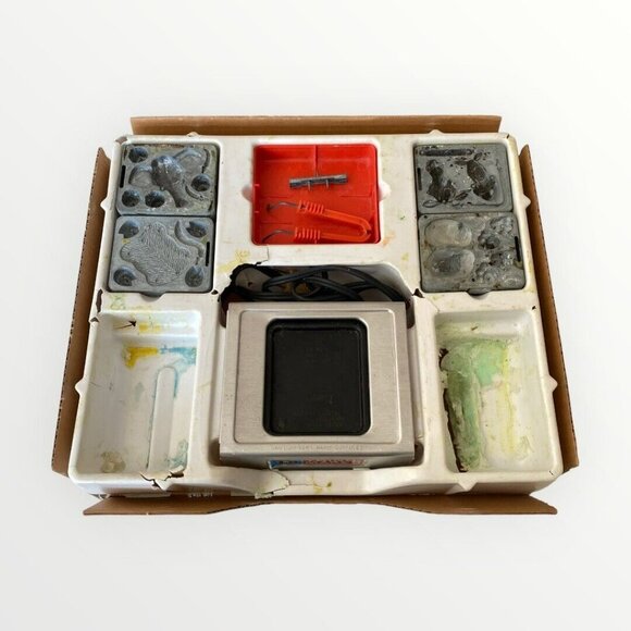 The heating unit works perfectly. No rust on the heating unit and the cord looks great. Front 'Thingmaker" sticker is peeling a bit on the unit. Comes with 7 molds, the cooling tray, the tool to remove the molds from the hot unit and a small piece with little spikes on it, not sure what the purpose is. No instructions. The goop bottles are empty. The plastic tray has holes/melting/cracks. The box has wear/tape on the corners.
