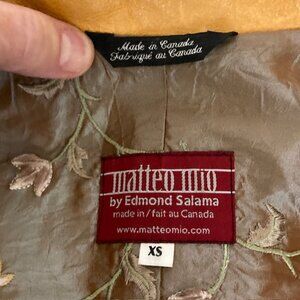 A gorgeous, rare vintage 3/4 length Matteo Mio woman's leather coat, designed by Edmond Salama. Probably 1990s, though the clean lines have a more timeless quality, and also suggests the look of coats a decade or two earlier. Maintained in nice condition, showing less than customary wear. As with all lightly-colored leather, it is slightly darker in some areas, but this is consistent with vintage leathers. (Personally, I wouldn't clean it, but leave it as is.) Embroidered laurel green satin lining, showing only minimal wear. Slash pockets are intact. No interior pocket. Original buttons. Size: XS. Pit-to-pit 17.5 inches, across shoulder 16, collar to hem 36. collar to cuff 32.5, sleeve 24. 5. This coat won't be for everyone, but for those that are drawn to bold fashion statements, this will look spectacular.