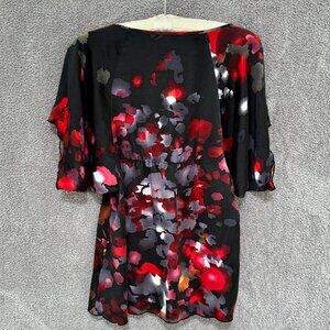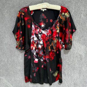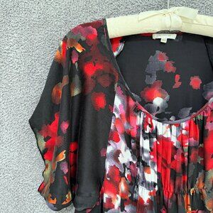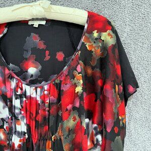 Gorgeous dark floral abstract print. Elastic at the front and back to draw in the loose, flowy fit a bit. The elastic is at the level of where the bottom of the sleeves attach, and this is about 3-4" below where your bra band would sit, so not a pit-to-pit measurement doesn't make sense in this circumstance. P2P gives the widest part of the chest, but in this top, that would be within the wide dropped sleeves. Low somewhat square neckline.