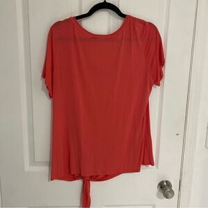 Picturing a coral rayon stretch short sleeve with a waist tie accent by Matty M in a womens size medium. Relaxed fit. Lightweight and cool.