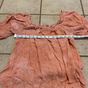 This beautiful off-the-shoulder blouse from Maurices is perfect for a casual, stylish look. The peach-colored fabric has a lovely textured, crinkle effect, and the shirred neckline and cuffs add a touch of bohemian charm. It features 3/4 length puffy sleeves with elastic at the cuffs. This top is a size XXL and is in excellent, gently used condition. A versatile piece that can be dressed up or down!
