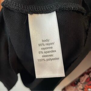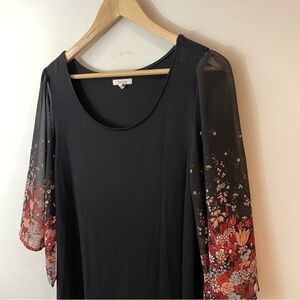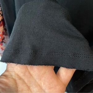 Excellent condition. No holes, stains, or signs of wear. Semi-sheer floral sleeve. Really cute print. Solid body with raw hem.