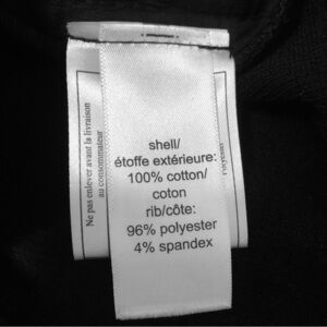 100% COTTON. RIBBED-96% POLYESTER, 4% SPANDEX
