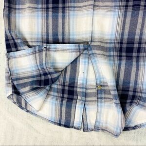 Women’s Size Medium. Blue and black plaid. Fold back cap sleeves. Button front. Button up back.