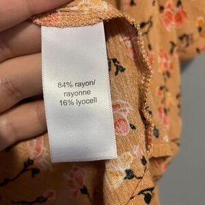 Floral mustard yellow blouse with a keyhole cut out in back and cuffed sleeves. Used but in excellent condition.