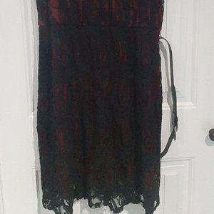 Maurices burgundy dress with black lace top layer, and black belt. Fits around size 10, slightly larger, accommodates larger chest.