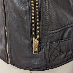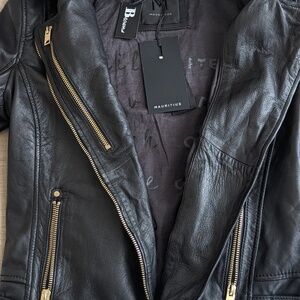 Make a statement with this genuine leather biker jacket from Mauritius. Crafted from soft, premium leather with gold-tone zippers and hardware.