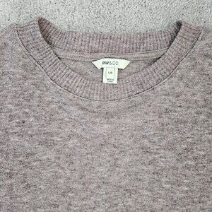 RW&CO. Mauve sweater with dropped shoulders and yarn design on sleeves.