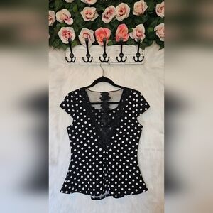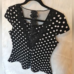 Add a touch of vintage charm to your wardrobe with this mauve peplum blouse, featuring retro-inspired polka dots, delicate lace details, and a hint of mesh. The feminine silhouette and playful design make it a standout piece for any occasion. Please note, there is a small hole in the mesh (as seen in the photo), which is reflected in the price. This blouse still offers incredible style and value, making it a great find.