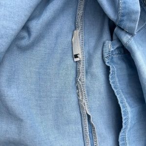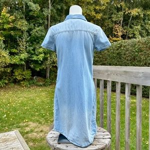 Mavi denim-look shirt dress. Front button closure. Short sleeves. Two patch bodice pockets. Belt loops, no belt included. Curved hem.
