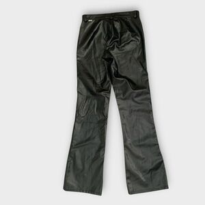 Black faux leather boot cut pants by Mavi, featuring a low to mid-rise fit, classic five-pocket styling, and a sleek glossy finish. These early 2000s pants are the perfect mix of edgy and timeless, great for casual or night-out looks.