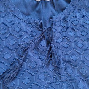 Max Cocos Dark Blue Semi Sheer Layered Tank Top Blouse Womens Notch Neck with Tassel Diamond Embroidered Pattern