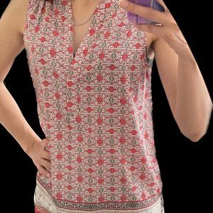 A flattering top in red color mixed with the neutral colors with tiny red buttons in its V-neck