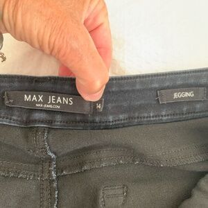 Max Jeans - Jeggings. Womens Sz 14. Very Dark Blue. Stretchy and very comfortable. I hemmed these jeans (see picture of hemmed legs). Inseam is 29".