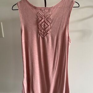 Max Jean Brand. Soft pink tank top with front and back details. Long, with a small flare fit at bottom. Measurements shown in photos. Tag say XS, but will fit small to x-small depending on how loose you like your tank top to fit. Great item to add to your closet for spring.