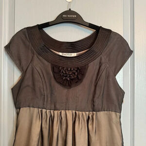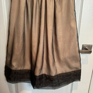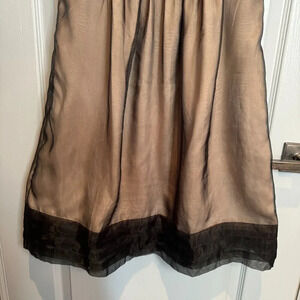 Beautiful dress from Max Mara featuring pleated detailing at the neck and hem, a sheer black overlay on top of a cream/tan base, fabric button embellishments at the chest, pockets, and cap sleeves. 100% silk construction, A-line silhouette with a round neck, size 4 US. Guaranteed authentic by the Legit Check app, certificate QR code included.