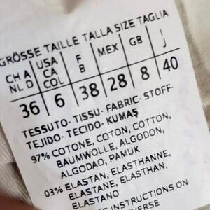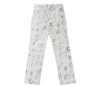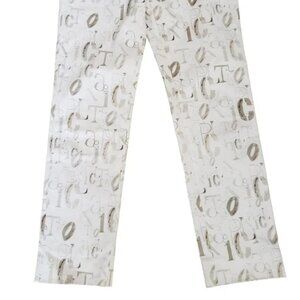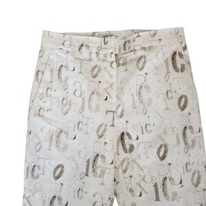 Super cute Max Mara ankle pants in a stretch denim. Off-white with fun lettering in brown/grey. French pockets on hip, zipper and hook closure at front. Like new condition!