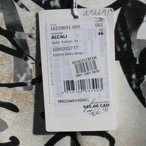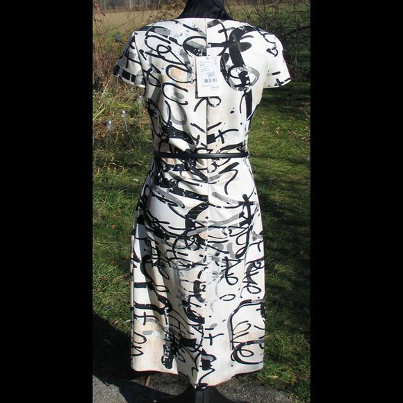 Higher end womens dress, capped sleeves, side zipper, includes belt. Back split at hem. Outer layer, double knit 94% Viscose, 6% Spandex, fully lined 100% Polyester. 38" 32" 39"