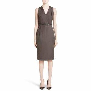 The Dattero sheath dress from Max Mara’s 2017 Spring and Summer collection is made in a cool crisp Dark Brown cotton poplin, and features a sleeveless design, a V-neck with a shawl lapel collar, a removable solid black faux leather belt, flattering tucks that nip the waist, a knee-length skirt, a back vent, a hidden back zip closure, and is lined in a tonal lightweight cotton.