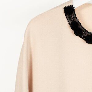 This coat from Max Mara Studio is crafted in a beige wool, and is embellished with black mesh, beading, and pompoms on the neckline. It features long sleeves, a scoop neck, hidden front snap closures, and front patch pockets.