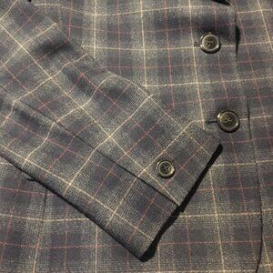 "Ultramarine check" short wool jacket by Max Mara Weekend, size IT42. Gorgeous very dark navy, almost grey, fabric, with check design in reddish-brown and muted yellow. Contrasting navy lining with floral and bird motives in the body and striped cream and dark grey in sleeves. Notch lapels, two front flap pockets. Two button closure. Two short back vents. Chest (flat) 19 inches, shoulders 15 1/2 inches, length 23 inches, sleeves 25 inches. Content tag removed, but if I remember correctly, it's a wool blend. Original tag and extra buttons are enclosed. Worn once, dry cleaned. Selling because it's a bit too tight for me now. Retailed for $645. Smoke and pet-free home.