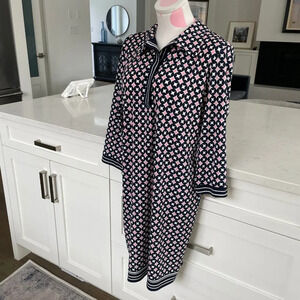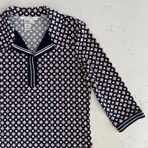 Max Studio 3/4 Sleeve Geometric Print Polyester Blend Polo Style Midi Dress in Navy, White + Pink