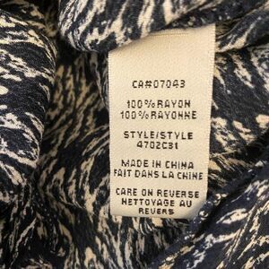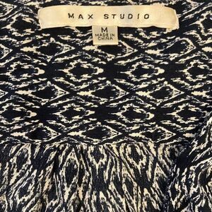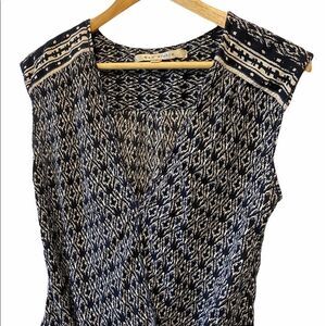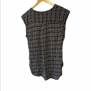 Stylish black and white top. Features a wrap design. Sleeveless with a patterned texture. Perfect for casual wear.