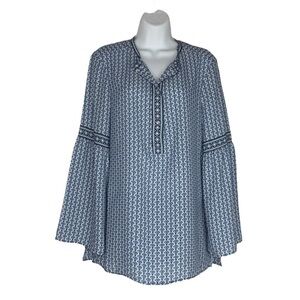 Max Studio Boho Blue and White Long Bell Sleeve Tunic Peasant Top Medium