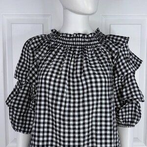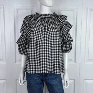 Stylish checkered blouse with layered ruffle sleeves. Features a gathered neckline. Ideal for casual wear.