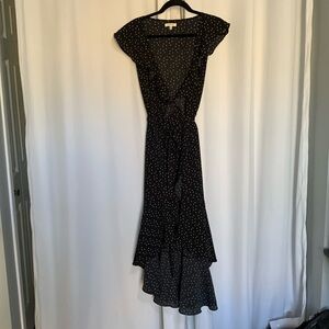 Sarong style wraps around tie dress. High-low style with ruffle around hem and neckline. Only worn once. Excellent condition!