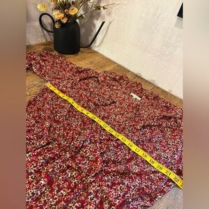 Blouse portefeuille fleurie de la marque Max Studio, dans une teinte rouge chaleureuse à imprimé floral blanc et vert. Encolure en V ornée de volants, manches longues à poignets élastiques, taille élastiquée avec ceinture à nouer. Tissu fluide et léger. Taille 2X.