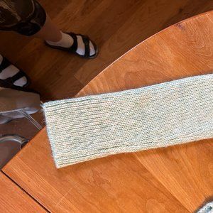 Scallop bottom with side slit. Knit pattern changes on bottom ¼ of the sweater. Very soft. Three button closure back of next on a 6.5 inch opening. Long slim sleeves with a 3.5 inch cuff.