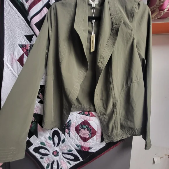 This Max Studio utility jacket in a rich green hue offers a structured design with a collared neckline and long sleeves. Crafted from durable materials, it embodies a clean, professional silhouette perfect for versatile styling.