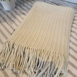 Max Studio Home, EUC, cream and silver throw wirh fringe. Sparkly silver threading throughout. Great for the holidays especially when close to twinkling lights!! No visible marks, stains or tears. I may have used it once.