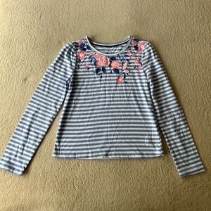 Adorable blue & white striped long sleeve tee featuring a charming pink & navy floral print across the chest & shoulders. Soft, lightweight with a slightly stretchy fit, perfect for everyday wear or layering in cooler weather.