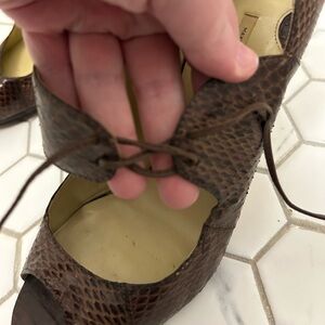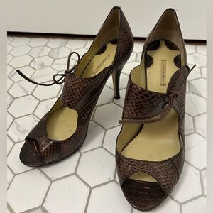 Faux snakeskin, but real leather pumps with an adjustable tie across the top of the foot. Brown leather snake skin texture and pattern make these unique and special, but are a neutral and beautiful. Some small marks on inside of upper sole (can see in pics) and some wear on bottom soles (see pics). Otherwise they are in good, sturdy condition, leather in excellent shape. 3.5” heels.