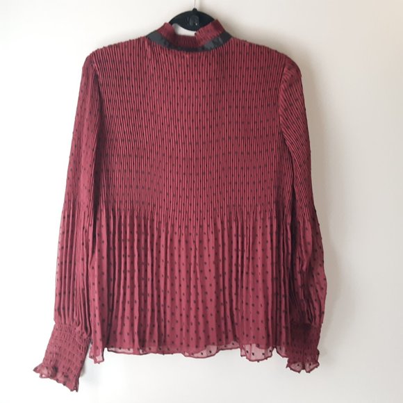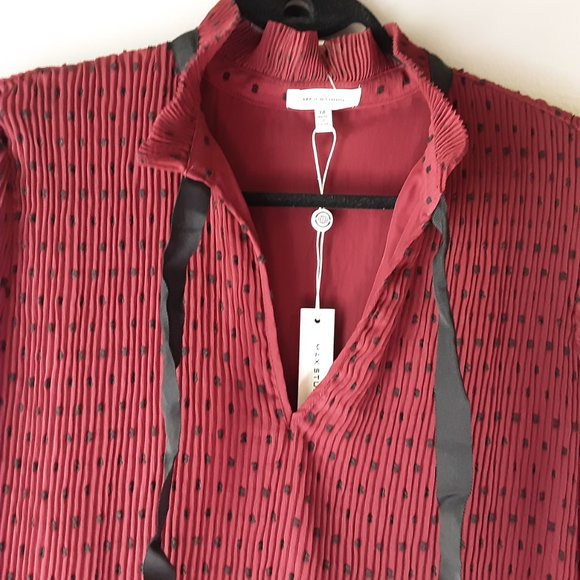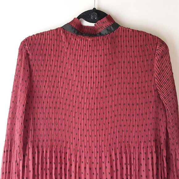 Max Studio Pleated Swiss Dot Burgundy Necktie Blouse, S