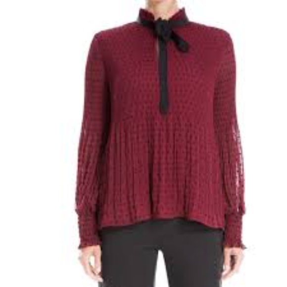 Max Studio Pleated Swiss Dot Burgundy Necktie Blouse