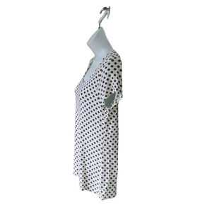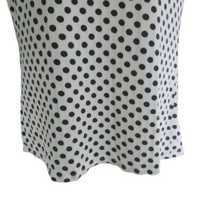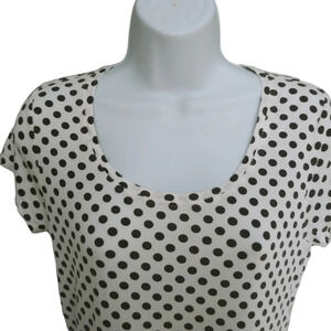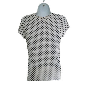 White t-shirt with black polka dots. Rounded neckline. Capped sleeves. A little extra long in the length to the hem.
