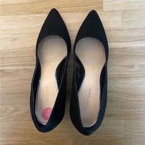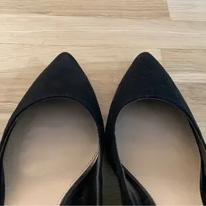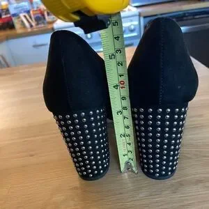 Black faux suede heels with block heel. Heels are decorated with silver/grey metal. 3” heel height.