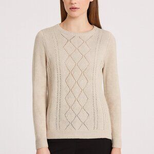 Long sleeve crewneck pullover. Diamond cable-knit with delicate openwork details