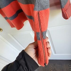 Retro style sweater with A-line shape. Both sides have zippers at the bottom. Cuffs at sleeves. Gray with Orange stripes at the bottom. Boat neck. Sweater does have a bit of pilling.