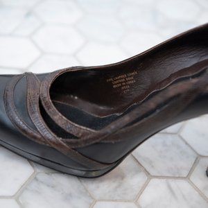 Max Studio black pump with brown cutout detail. 4" heel and rounded toe. Slight platform, leather sole. Comfortable for a heel.