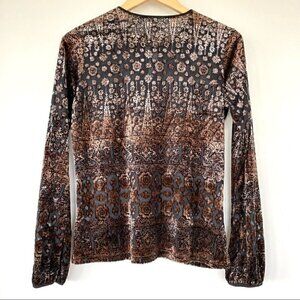 Max Studio burnout velvet top with long sleeves, elasticized at the hems. V-neckline with ties. Beautiful pattern in a mix of brown and black. In perfect condition.