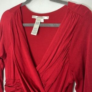 In great condition. 92% viscose 8% spandex. Strechy jersey type of fabric. Flattering crossfront details. Ruching on the shoulder, side and sleeve. Perfect for office, Christmas party. Measure lay flat; shoulder 15,5'' bust 18'' waist 15,5'' hips 19,5'' length 39'' sleeve length 24''.