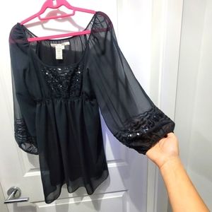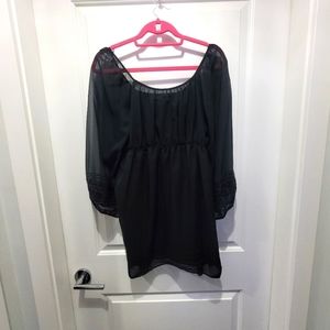 Chiffon material very lightweight. Empire waist and bell sleeves. Lined thrpugh out.. In excellent condition.