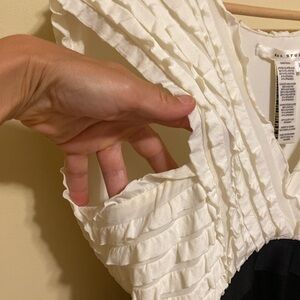 Beautiful fitted sleeveless mini dress with white/cream ruffled top and black fitted Bodycon bottom.
